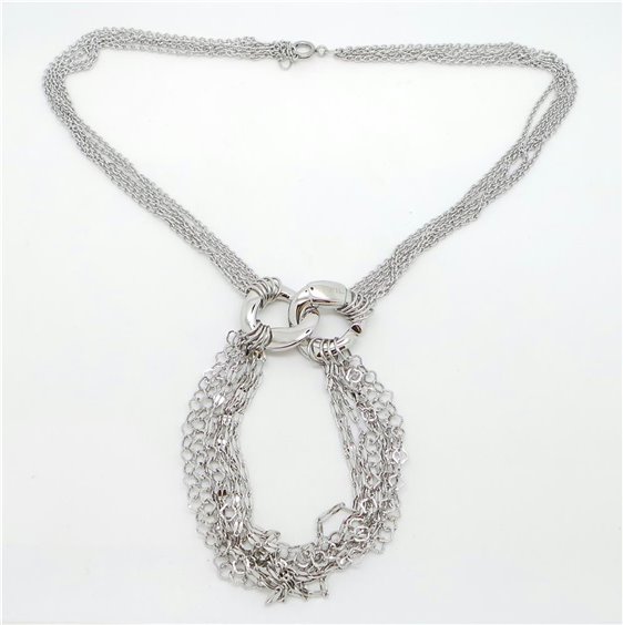 Collana in acciaio formata da catene di diverso stile e lunghezza, intervallate da due originali e ingegnose chiusure che permettono di portare il gioiello in altrettanti diversi modi. Indossata in tutta la sua lunghezza, la collana si scioglie in un girocollo sfavillante, ma agganciando le chiusure la collana si accorcia come uno strangolino.