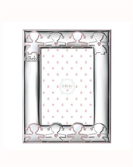 Cornice grande femminuccia in argento bilaminato. Sagome bimba in rilievo e smalto rosa. Portafoto interno 10x15 cm. Retro in legno rosa.