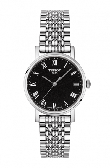 Orologio solo tempo da donna della collezione Everytime smal. Cassa in acciaio del diametro di 30 Mm. Quadrante nero, indici con numeri romani. Cinturino in acciaio, resistente all’acqua 3 atmosfere, movimento al quarzo.