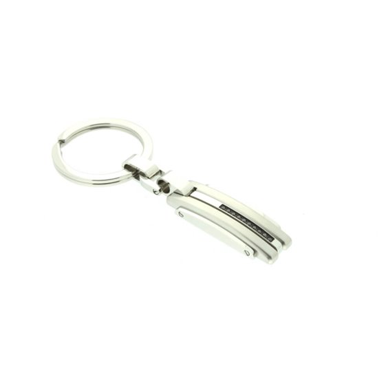 ortachiavi Zancan in acciaio e zirconi. Il pendente (lunghezza 5.5 cm) è collegato all’anello portachiavi da una robusta maglia in acciaio e decorato con bande in acciaio satinato tra cui si trova una fila di zirconi neri. Un accessorio solido e sobrio per l’uomo elegante e pratico